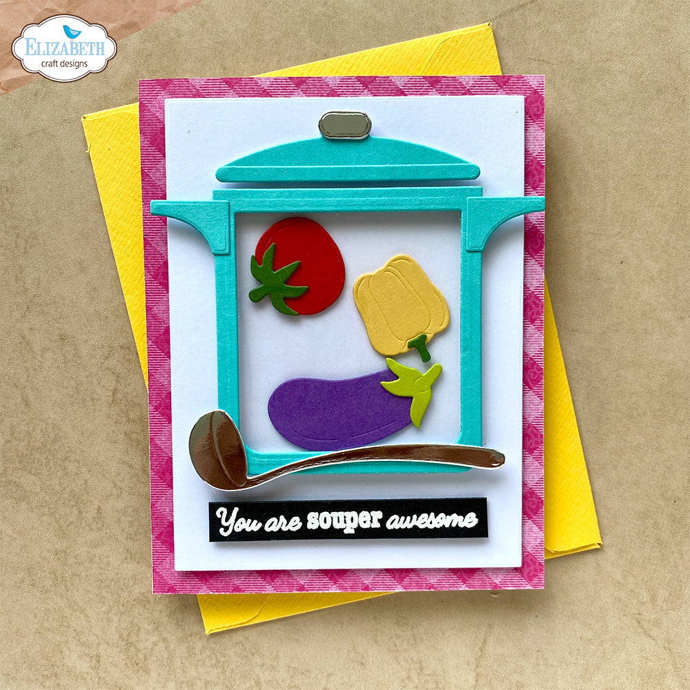 Elizabeth Craft Designs Cooking Pot Dies, part of the Cute & Whimsical Living it Up Collection by Joset van de Burgt, bring a playful culinary theme to your crafting projects. This wafer-thin die set includes 11 pieces, with the largest measuring approximately 4.2 x 3.1 inches. The designs feature a large stock pot with lid, along with a ladle, spoon, and an assortment of vegetables—carrots, leeks, tomatoes, broccoli, peppers, eggplant, cucumber, and potatoes.